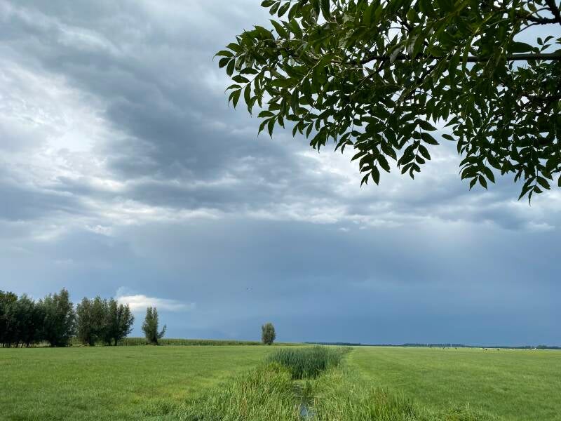 En als je achter het huis naar het noorden kijkt, zie je wolkenluchten zover de horizon reikt. Elke dag weer een ander verhaal.