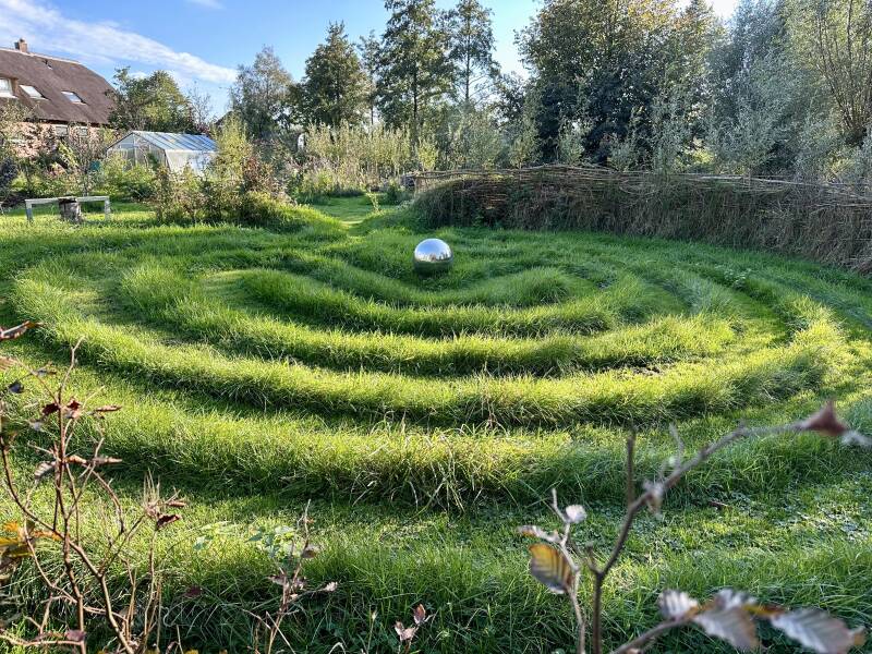 Met de aanwezigen, afkomstig uit Nieuwerbrug, Bodegraven en zelfs Amsterdam, liepen we een rondje door de Levenstuin. Fijn te horen hoe leuk mensen het vinden dat er verschillende delen met een heel andere sfeer zijn. De gele en rode snijbiet toonde zich in haar volle glorie en de meningen over het verschil tussen dille en venkel bleven verdeeld. Dat wol ter bestrijding van slakken niet werkt, kreeg ik bevestigd door een andere tuinier en bloeiende snijsla kent bijna niemand. Het labyrint toonde zich als een hart en het toppunt was wel de rode wouw die vlakbij, een prooi spottend, in de lucht hing. Voor de kas gezeten, werd er gezellig van alles uitgewisseld.