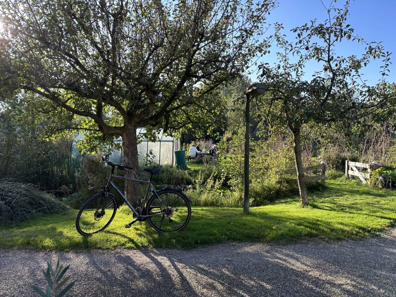 Het eerste Levenscafé zou om 16.30 uur worden geopend door Esther Ritman. Om half 4 belt ze: "Ik sta vast bij de Coentunnel, de navigatie zegt dat ik er om 16.45 uur ben." Ik probeer haar gerust te stellen dat ik wel eerst de bezoekers een rondleiding door de Levenstuin zal geven. Iets na vier uur komen de eerste mensen aangefietst. Het is een prachtige dag, het licht is mooi en de tuin ligt er ondanks de herfst nog steeds mooi bij. Niet alleen bloeiende bloemen, maar ook de uitgebloeide zijn prachtig in de lage zon.