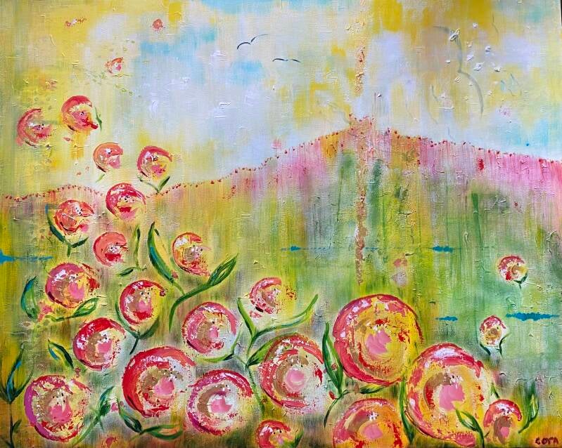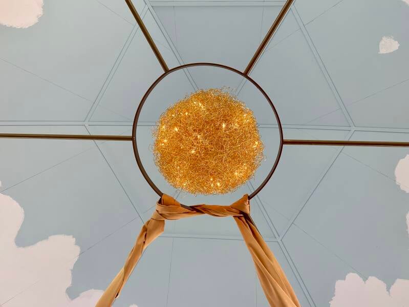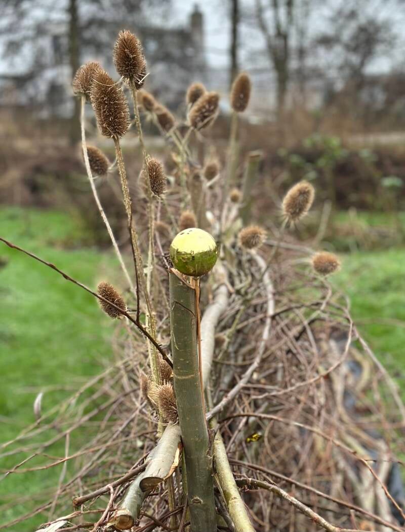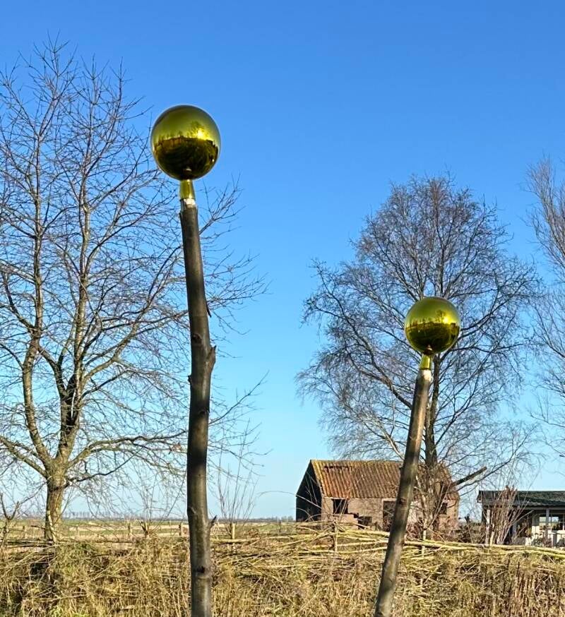 Ik heb iets met gouden ballen. Het is begonnen toen ik tijdens mijn opleiding hypnotherapie in een meditatie op zoek ging naar mijn ideale wereld. Daar verscheen een grote gouden bol. Ik durfde het niet te benoemen, dat leek me hoogmoedig. Die gouden bal liet me niet los. Toen ik bij het verbouwen bedacht hoe mijn Hooiberg er van binnen uit moest zien, was dat met een gouden bol in het midden, de zon. Als ik zoiets zeg gaat Wim op zoek. Hij vond iemand in Gouda die lampen maakte met draadvlechtwerk in bolvorm. Die lampen waren van zilverdraad. Ik nam contact met haar op of het ook in goudkleurig draad kon met lampjes. En ja, een paar weken later had ze voor mij een goudkleurige bolvormige lamp gemaakt, die als zon in de ruimte van de Hooiberg hangt. Ik kocht goudkleurige verf om in mijn schilderijen gouden ballen te kunnen toveren. En nu heb ik ze ook in de tuin. Ik word er zo blij van.