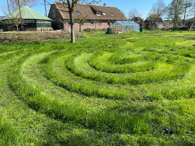 In het gras hebben vriendin Marjo en ik begin 2023 een labyrint aangelegd. Dat was een klusje van passen en meten. De lijnen hebben we gelegd met houtsnippers. Ondertussen zijn de houtsnippers verdwenen in het lange gras, de paden van het labyrint maai ik nu.